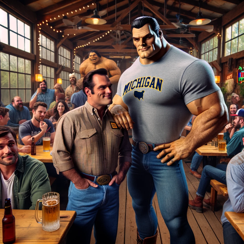 DALLE 2024-01-24 210700 – An image depicting two fictional characters The Landman and Hotdog hanging out at an ice house in Houston Texas The Landman is portrayed as Leave a Comment / By Landman Life / January 26, 2024 #image_title